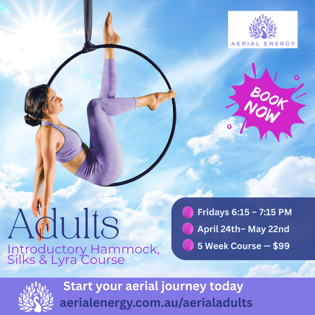 Are you ready to embark on an exciting new adventure? Our 5-week Introductory Silks, Hammock & Lyra Course is perfect for adults aged 16+ who want to explore the world of aerial arts, no prior experience required!